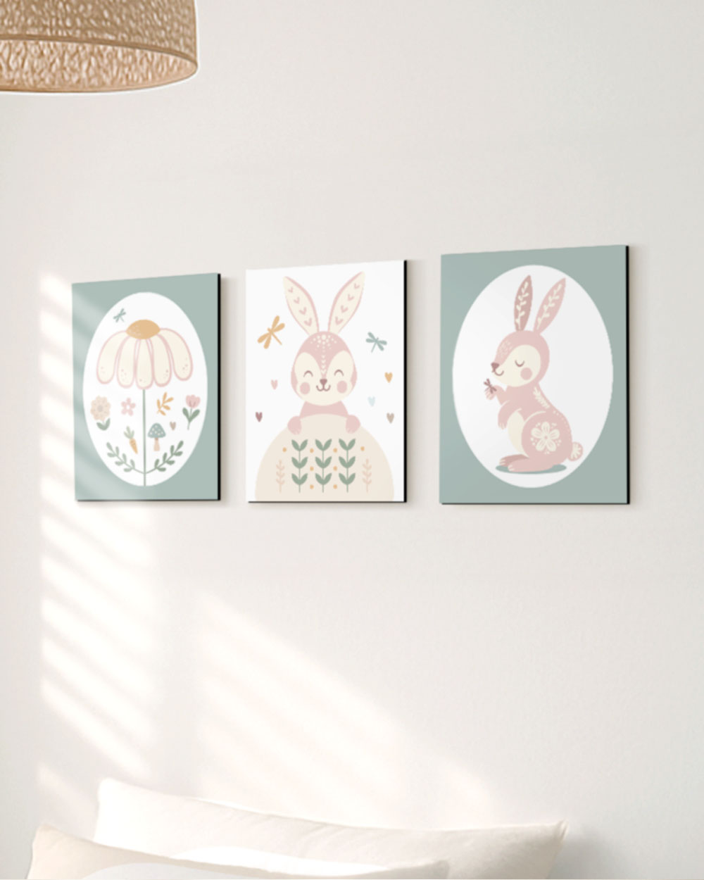 שלישיית תמונות ארנבונים שמוסיפה מתיקות וחום לחדר.