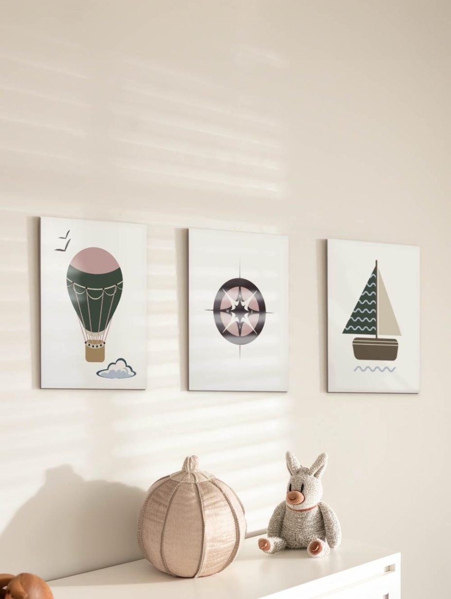 שלישיית תמונות Future Explorer (חוקר עתידי) שמדליקה את הדמיון ופותחת אופק לחדר, תלייה קלה ללא כלי עבודה, מתנקה במטלית. זמינה לבחירה עם או בלי מסגרת להתאמה מושלמת לסגנון החדר.